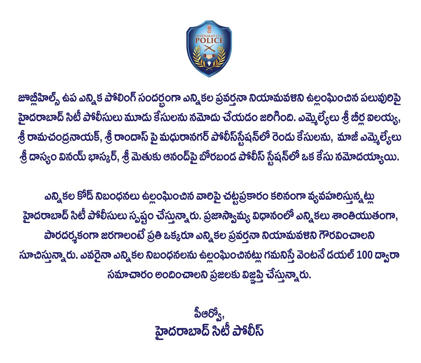 The Hyderabad City Police has registered three cases against several individuals for violating the Model Code of Conduct (MCC) during the polling for the Jubilee Hills Assembly By-election.